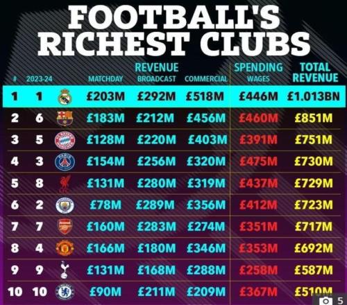 据《每日电讯报》报道,曼联首次在德勤足球财富榜中被利物浦和阿森纳超越,而皇马仍旧稳居榜首,显示其在商业上的巨大成功。