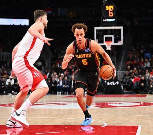 本场比赛中,老鹰的先发得分后卫戴森-丹尼尔斯(Dyson Daniels)的表现令人大跌眼镜。丹尼尔斯全场出场31分29秒,投篮12中2,三分线外3中0,得到了4分6篮板7助攻3抢断的数据,其中还包括了4个前场篮板,还有1次失误和2次犯规,正负值为+2。一方面,丹尼尔斯在防守端的表现绝对是值得肯定的,他也展现出了自己应有的个人防守能力并且起到了相当不错的效果。不仅如此,丹尼尔斯在篮板争抢方面的表现也是值得肯定的,而且他在传球和组织方面也是起到了一定的作用的。然而另一方面,丹尼尔斯的进攻效率实在是太糟糕了,他的突破能力完全没有发挥出来,他在外线投篮方面的稳定性更是惨不忍睹。