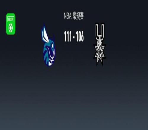 第四节黄蜂迈尔斯-布里奇斯拿下7分,马刺哈里森-巴恩斯拿下8分,最终黄蜂111-106战胜马刺